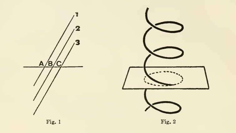 Suppose now all the water to be removed except a film. At the meeting of the film and the stick there will be an interruption of the film. If we suppose the film to have a property, like that of a soap bubble, of closing up round any penetrating object, then as the stick goes vertically downwards the interruption in the film will move on. If we pass a spiral through the film the intersection will give a point moving in a circle (shown by the dotted lines in Fig. 2).