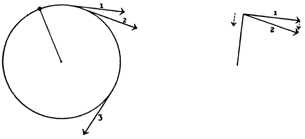 All the vectors in the diagram representing this motion have the same length if the speed is uniform. Nevertheless, the velocity is not uniform, for the path is not a straight line. Only in uniform, rectilinear motion are there no forces involved. Here, however, there are, and the velocity changes not in magnitude but in direction. According to the law of motion there must be some force responsible for this change, a force in this case between the stone and the hand holding the string. A further question arises immediately: in what direction does the force act? Again a vector diagram shows the answer. The velocity vectors for two very near points are drawn, and the change of velocity found. This last vector is seen to be directed along the string toward the centre of the circle, and is always perpendicular to the velocity vector, or tangent. In other words, the hand exerts a force on the stone by means of the string.