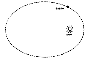A very important example of motion is that of the earth around the sun. It is known that the path is a closed curve, called the ellipse. The construction of a vector diagram of the change in velocity shows that the force on the earth is directed toward the sun. But this, after all, is scant information. We should like to be able to predict the position of the earth and the other planets for any arbitrary instant of time, we should like to predict the date and duration of the next solar eclipse and many other astronomical events. It is possible to do these things, but not on the basis of our initial clue alone, for it is now necessary to know not only the direction of the force but also its absolute value its magnitude. It was Newton who made the inspired guess on this point. According to his law of gravitation the force of attraction between two bodies depends in a simple way on their distance from each other. It becomes smaller when the distance increases. To be specific it becomes 2×2=4 times smaller if the distance is doubled, 3×3 = 9 times smaller if the distance is made three times as great.