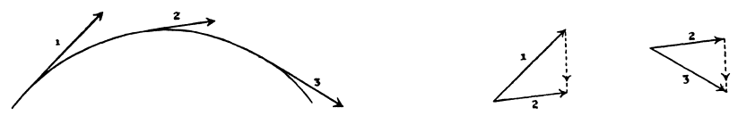 The clue to an explanation of motion along a straight line was simple: external force is responsible for change in velocity; the force vector has the same direction as the change. And now what is to be regarded as the clue to curvilinear motion? Exactly the same! The only difference is that change of velocity has now a broader meaning than before. A glance at the dotted vectors of the last two drawings shows this point clearly. If the velocity is known for all points along the curve, the direction of the force at any point can be deduced at once. One must draw the velocity vectors for two instants separated by a very short time interval and therefore corresponding to positions very near each other. The vector from the end-point of the first to that of the second indicates the direction of the acting force. But it is essential that the two velocity vectors should be separated only by a “very short” time interval. The rigorous analysis of such words as “very near”, “very short” is far from simple. Indeed it was this analysis which led Newton and Leibnitz to the discovery of differential calculus.
