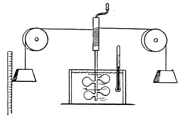 A clever alteration in this sort of mechanism enabled Joule to measure the heat lost and thus the rate of exchange. In his apparatus two weights caused a paddle wheel to turn while immersed in water. The potential energy of the weights was changed into kinetic energy of the movable parts, and thence into heat which raised the temperature of the water. Joule measured this change of temperature and, making use of the known specific heat of water, calculated the amount of heat absorbed. He summarized the results of many trials as follows: