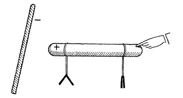 The experiment is performed as follows: we look to see whether the leaves hang close together, for this is their normal position. If by chance they do not, a touch of the finger on the metal rod will bring them together. These preliminary steps being taken, the rubber rod is rubbed vigorously with the flannel and brought into contact with the metal. The leaves separate at once! They remain apart even after the rod is removed.