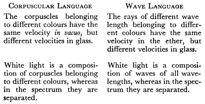 It follows that Newton’s experiments on the dispersion of light can be described in two different languages, that of the corpuscular theory and that of the wave theory. For example: