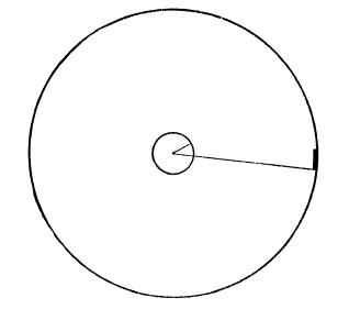 The inside observer on the disc begins measuring the radius and circumference of the small circle. His result must be the same as that of the outside observer. The axis on which the disc rotates passes through the centre. Those parts of the disc near the centre have very small velocities. If the circle is small enough, we can safely apply classical mechanics and ignore the special relativity theory. This means that the stick has the same length for the outside and inside observers, and the result of these two measurements will be the same for them both. Now the observer on the disc measures the radius of the large circle. Placed on the radius, the stick moves, for the outside observer. Such a stick, however, does not contract and will have the same length for both observers, since the direction of the motion is perpendicular to the stick. Thus three measurements are the same for both observers: two radii and the small circumference. But it is not so with the fourth measurement! The length of the large circumference will be different for the two observers. The stick placed on the circumference in the direction of the motion will now appear contracted to the outside observer, compared to his resting stick. The velocity is much greater than that of the inner circle, and this contraction should be taken into account. If, therefore, we apply the results of the special relativity theory, our conclusion here is: the length of the great circumference must be different if measured by the two observers. Since only one of the four lengths measured by the two observers is not the same for them both, the ratio of the two radii cannot be equal to the ratio of the two circumferences for the inside observer as it is for the outside one. This means that the observer on the disc cannot confirm the validity of Euclidean geometry in his c.s.