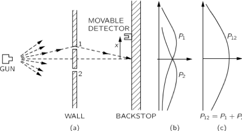 The result P12 obtained with both holes open is clearly not the sum of P1 and P2, the probabilities for each hole alone. In analogy with our water-wave experiment, we say: “There is interference.”
