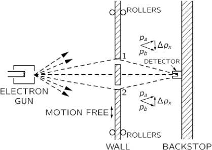 Let us show for one particular case that the kind of relation given by Heisenberg must be true in order to keep from getting into trouble. We imagine a modification of the experiment of Fig. 1–3, in which the wall with the holes consists of a plate mounted on rollers so that it can move freely up and down (in the x-direction), as shown in Fig. 1–6. By watching the motion of the plate carefully we can try to tell which hole an electron goes through. Imagine what happens when the detector is placed at x=0. We would expect that an electron which passes through hole 1 must be deflected downward by the plate to reach the detector. Since the vertical component of the electron momentum is changed, the plate must recoil with an equal momentum in the opposite direction. The plate will get an upward kick. If the electron goes through the lower hole, the plate should feel a downward kick. It is clear that for every position of the detector, the momentum received by the plate will have a different value for a traversal via hole 1 than for a traversal via hole 2. So! Without disturbing the electrons at all, but just by watching the plate, we can tell which path the electron used.