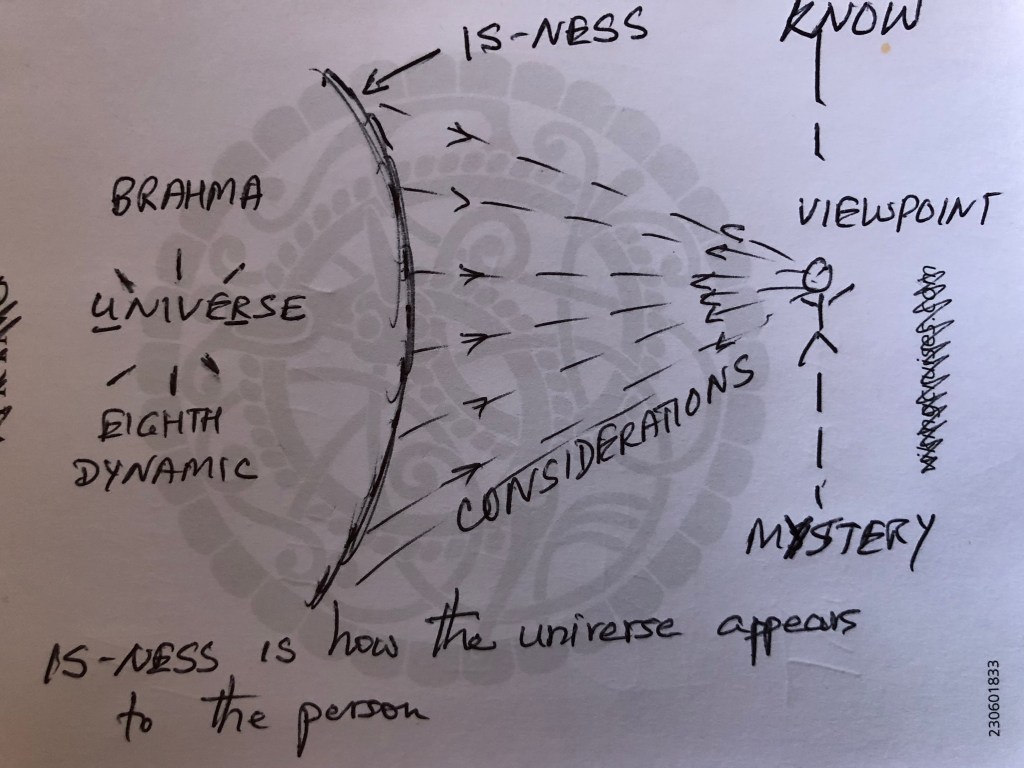 We have a scale of Dynamics from Dynamic Eight narrowing down to Dynamic One. And a scale of Affinity from Knowingness narrowing down to Mystery. The viewpoint of a person lies on these scales. The considerations of this viewpoint create the corresponding IS-NESS of the universe for that person.