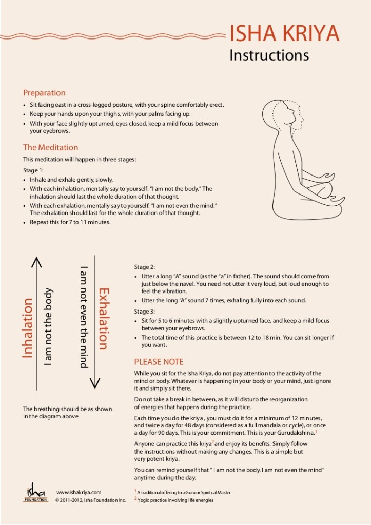 This exercise is taught at Sadhguru’s ISHA Foundation. Please do this exercise as instructed. If you cannot sit in a cross-legged posture comfortably then you may sit on a chair facing East (see Detachment).