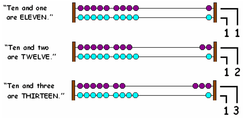 We count beyond 10 by moving beads on the first wire again.