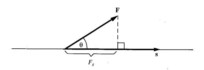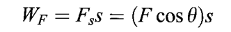 The work WF due to a constant force F acting on an object while it moves through a displacement s is defined as the component of F along the s direction multiplied by the magnitude of s.
