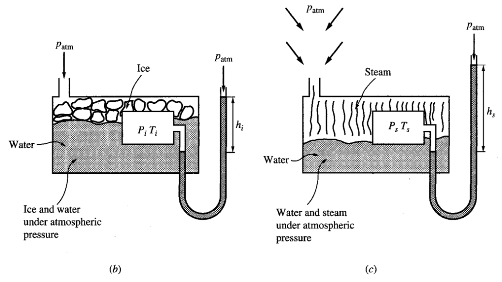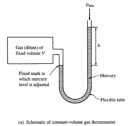 This thermometer consists of a gas confined to a fixed volume, with an open-tube manometer used to measure the pressure of the gas inside. Constant volume gas thermometer is often considered the “standard” against which other thermometers are calibrated.