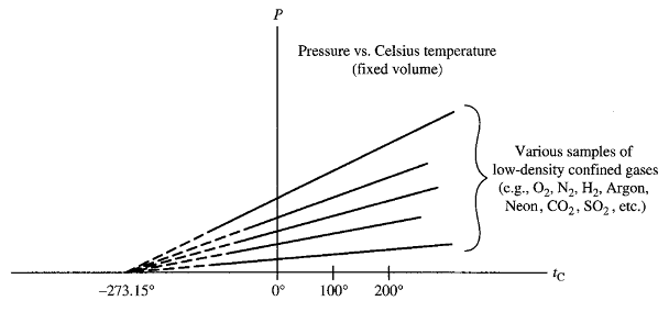 The graphs of pressure vs. temperature of all very low-density gases at fixed volumes are straight lines. When extrapolated these straight lines intersect the temperature axis at the same point: -273.15°C. On the basis of this result, one defines the Kelvin (or absolute) temperature scale. It is same as the Celsius Scale with its zero shifted to “-273.15°C”.