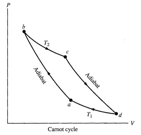 A Carnot cycle is a system undergoing a quasistatic cyclical process involving four legs, with two being isotherms and two being adiabats. Such a process is represented on the P-V diagram as follows: