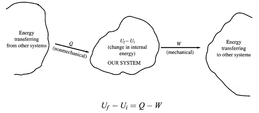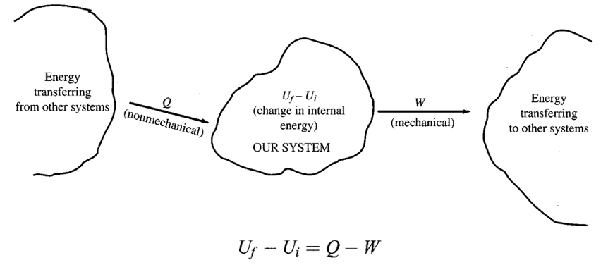 Where Q is the algebraic heat entering the system; and W is the algebraic work done by the system on the outside world during the same process.