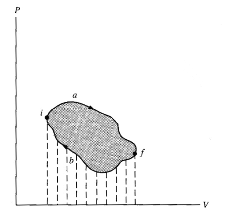 A cyclical process may consist of the same of different quasistatic processes. In a cyclical process the work done is plus or minus the area enclosed by the closed cycle path on the P-V diagram.