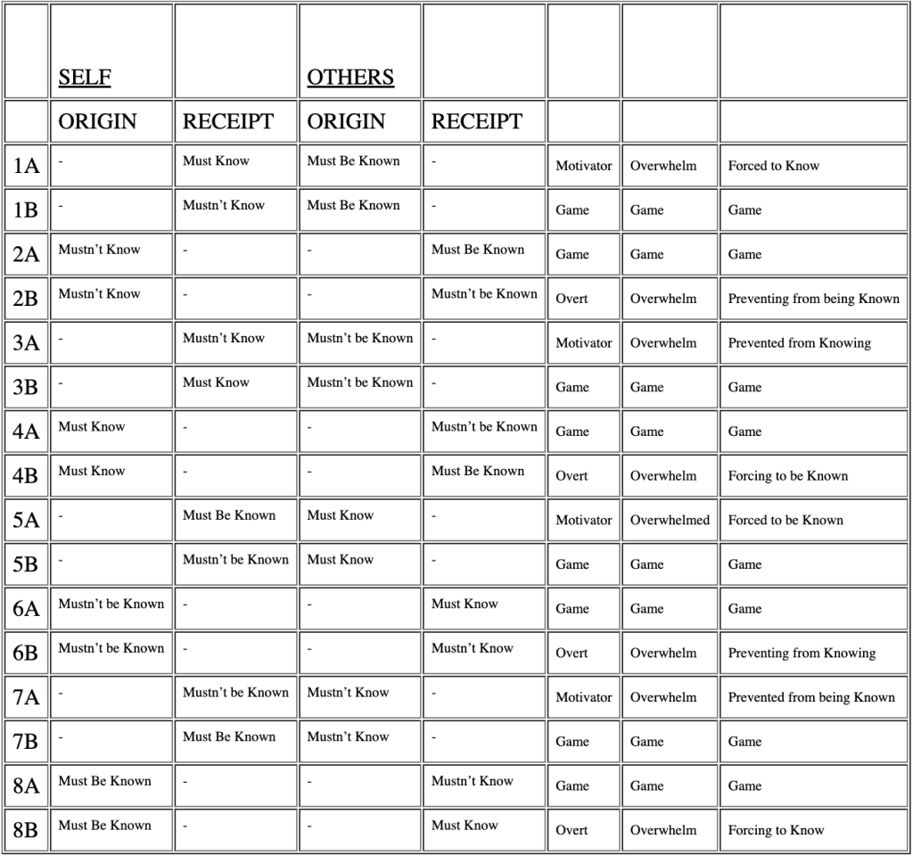 “So now we’ve gone through a whole little cycle, haven’t we. We’ve gone through a whole little cycle. We had the complementary postulates at level 1A with “Must be known” and “Must know”. We’ve gone through two game cycles and now we’ve gone back to complementary postulates again. But notice that the postulates have changed. We are now at 2B. At 2B we have “Mustn’t Know” – “Mustn’t be known” and we are back with complementary postulates again. But now you are at the origin point and the “Mustn’t be Known” is at the receipt point.
