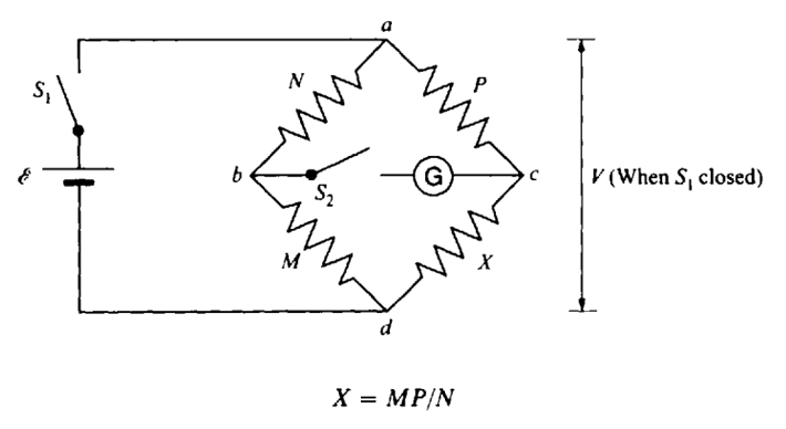 In the circuit for the Wheatstone bridge shown below, the unknown resistor is X, and the other resistors M, N and P are known. When the EMF is applied to the circuit, the known resistors are adjusted so that no current flows through the galvanometer G, between points b and c. Then no adjustments are necessary for the resistance of the galvanometer. The unknown resistance X may then be determined in terms of known resistors M, N and P.