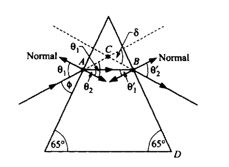 When the light leaves the prism its direction of motion is at an angle δ from the incident direction. This is the “angle of deviation“.