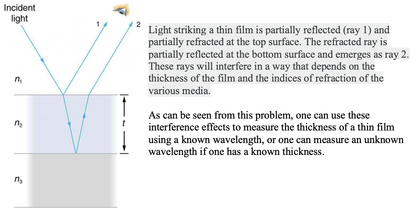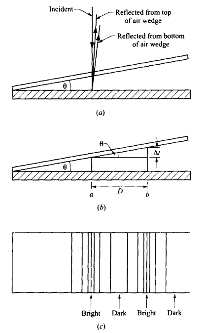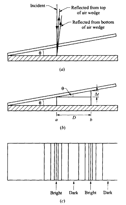 A wedgeconsistsof two smooth glass plates that make a very small angle with each other. The air between the plates forms a “thin film” whose thickness increases as we move away from the corner. For the wavelength of the incident light there will be a point along the bottom plate where the thickness of the film is just right to give constructive interference. The result is a series of “fringes,” or alternating bright and dark fringes along the glass plate.