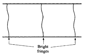 If the glass is not exactly smooth, the bright fringes will be somewhat distorted. The wavy line traces out points where the distance between the top and bottom plates is constant. This can be used to measure the smoothness of a plate. If the lines are distorted, one knows where one has to remove a small amount of glass and can grind the glass there to achieve better smoothness. Since these fringes are sensitive to distances of fractions of a wavelength, this can assure smoothness to that order of distance.