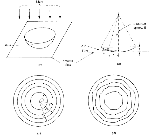 When a sector of a glass sphere is placed on a smooth glass plane, there is an air film between the lower surface of the sector and the plane. The height of this film increases as one moves out from the center. Points of equal height form circles around the center. Therefore, circular fringes appear because of the wedge principle above.