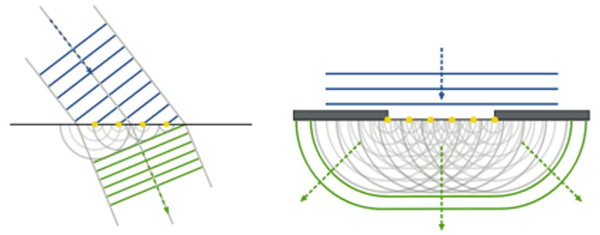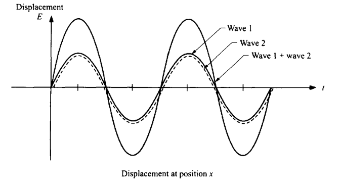 If we have more than two waves then we must add together all the waves to get the resultant wave. This will clearly result in a more complicated calculation in practice, although the underlying principle is still the same. Typically, when we consider waves traveling through openings in different barriers arriving at a common point, we use the term interference to characterize the results of their addition. This often involves the addition of a relatively small number of waves. If we add together waves coming from different parts of a single aperture and arriving at a common point, we usually refer to the effect as diffraction, and the addition can involve, in principle, large numbers of waves. Nonetheless, the basic principle for diffraction is the same as for interference.
