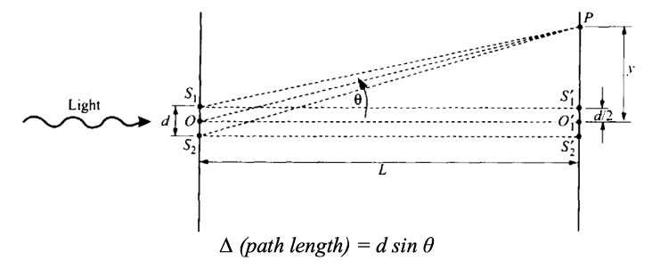 We can now determine the angles at which we have destructive and constructive interference by equating this difference in path length to the appropriate multiples of λ. The angle at which the first maximum occurs depends on λ/d. When λ/d is small, then sin θ is small, as is θ. If the ratio is not too small, one can see these interference effects. For wavelengths that are very short compared to the geometric dimensions of slits and apertures, there is little ability of the light to bend and there will be neither diffraction nor interference that is detectable. To see fringes, one needs this ratio to be much less than 1, but still not minuscule. One could use the double slit to measure the wavelength of some unknown radiation by measuring the angle at which interference occurs. In practice, one gets greater experimental accuracy if one uses a diffraction grating that contains thousands of slits rather than just two slits.