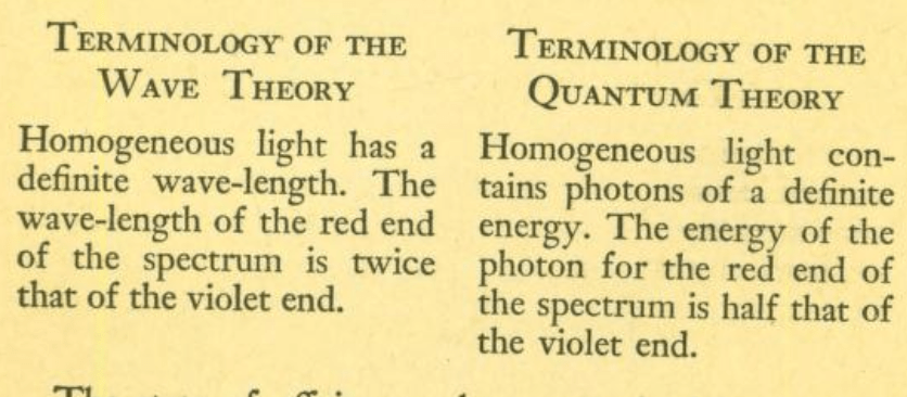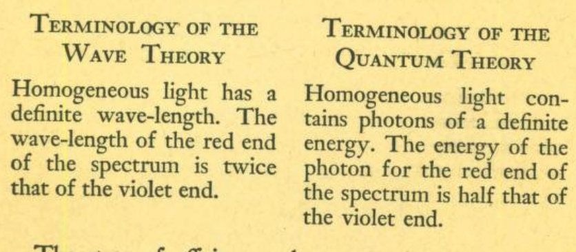 All that has just been said can now be translated into the photon language. The stripes correspond to certain definite wave-lengths or, in other words, to photons with a definite energy. Luminous gases do not, therefore, emit photons with all possible energies, but only those characteristic of the substance. Reality again limits the wealth of possibilities.