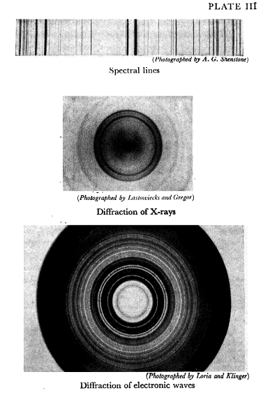Suppose that a beam of X-rays falls upon a crystal and, after passing through it, is recorded on a photographic plate. The plate then shows the diffraction pattern. Various methods have been used to study the X-ray spectra, to deduce data concerning the wavelength from the diffraction pattern. What has been said here in a few words would fill volumes if all theoretical and experimental details were set forth. In Plate III we give only one diffraction pattern obtained by one of the various methods. We again see the dark and light rings so characteristic of the wave theory. In the centre the non-diffracted ray is visible. If the crystal were not brought between the X-rays and the photographic plate, only the light spot in the centre would be seen. From photographs of this kind the wave-lengths of the X-ray spectra can be calculated and, on the other hand, if the wave-length is known, conclusions can be drawn about the structure of the crystal.