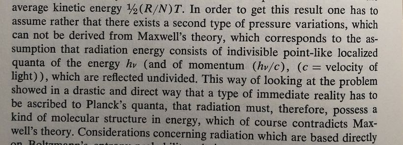 Einstein established beyond any doubt that electromagnetic radiation has particle-like properties. In spite of its wave properties radiation was not a disturbance in some postulated ether. Radiation field could exist in space quite independently of palpable matter. Einstein visualized radiation as made up of unchanging energy-packets (quanta) distributed discontinuously in space. Einstein proved further that energy and mass are equivalent, and mechanics could no longer be maintained as the foundation of physics.
